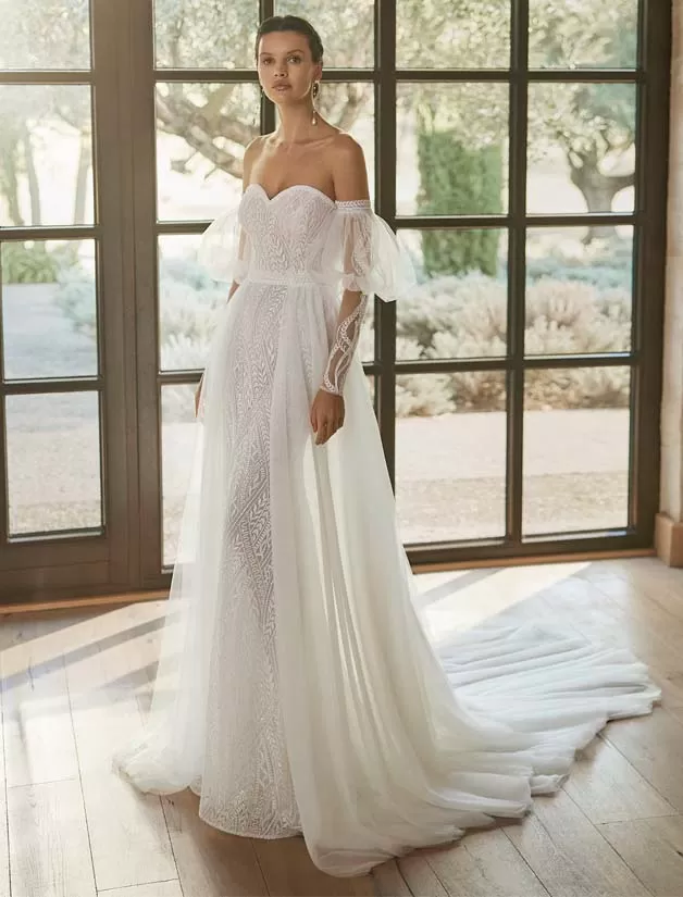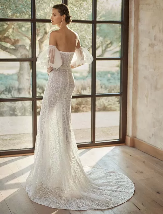 Gilian è un abito da sposa sirena senza spalline e con scollo a cuore davvero sensuale. Perfetto per una cerimonia sulla spiaggia in estate, quest’abito sorprende con la scollatura sulla schiena e i dettagli di pizzo. Include maniche rimovibili e una sopraggonna leggera.