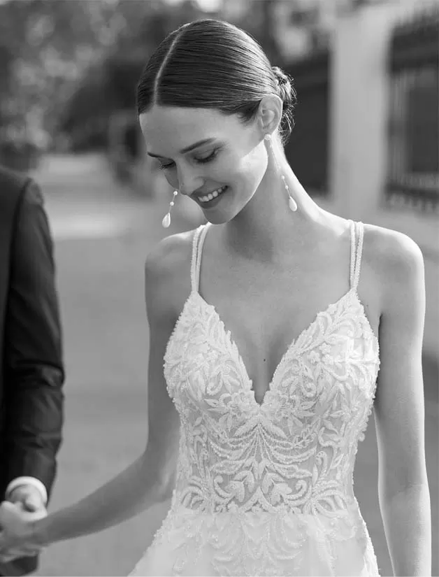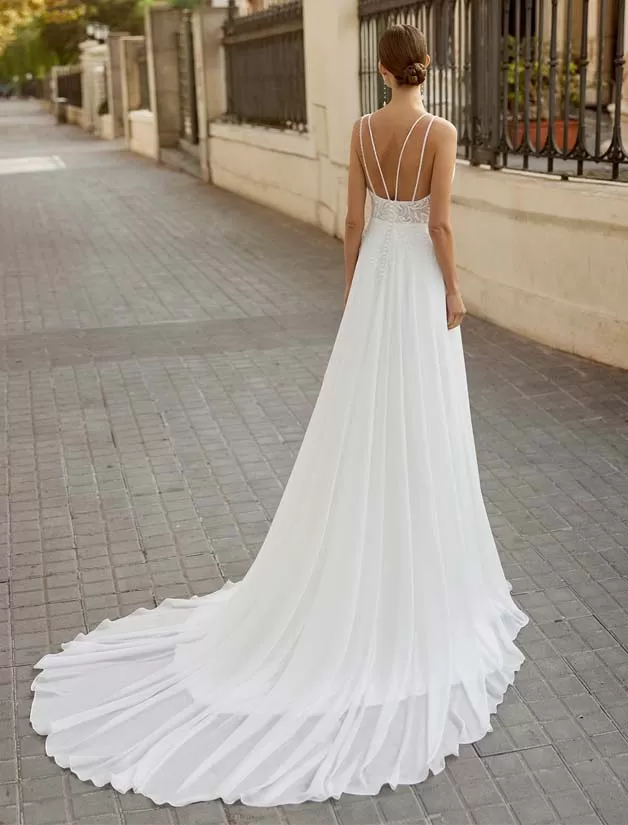 Arlette è il modello ideale per chi sogna un abito giovanile. Il comodo taglio dritto è esaltato dal corpetto ricamato e tempestato di strass, perfetto per una cerimonia religiosa in primavera. Le spalline incorniciano lo scollo a V sul davanti e l’elegante scollatura sulla schiena. Dalla vita scivola la gonna in georgette con spacco laterale.
