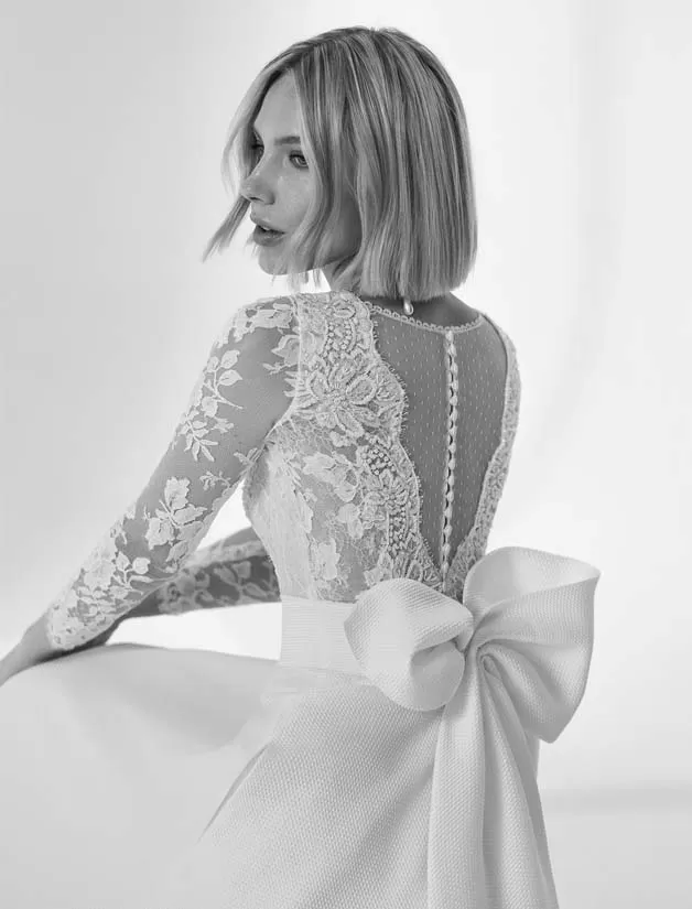 Abito da sposa con gonna redingote in stile classico, confezionato in pizzo con passamaneria a onda di strass e gonna in Amalfi; scollo a V sul davanti e sulla schiena con onde incrociate e tulle effetto illusione; ampia fusciacca in Amalfi e maniche lunghe in pizzo Abito Aire Atelier Esclusivo di alta moda.
