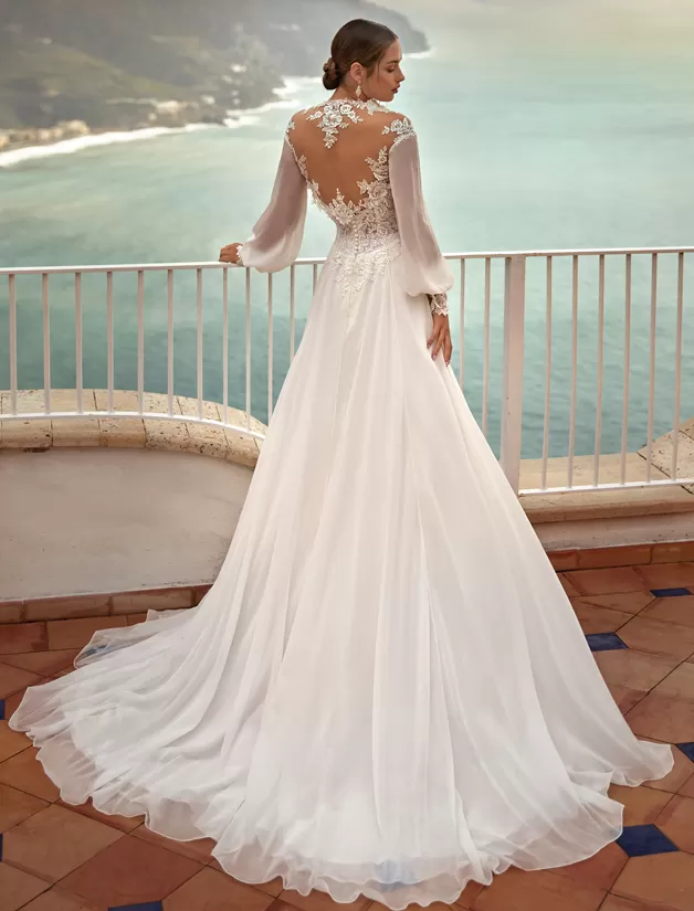 Romantico abito da sposa scivolato in raso off white e corpino di pizzo smanicato con scollo a cuore. La cappa in pizzo con maniche lunghe rende perfetto questo look per la cerimonia e la sera.
