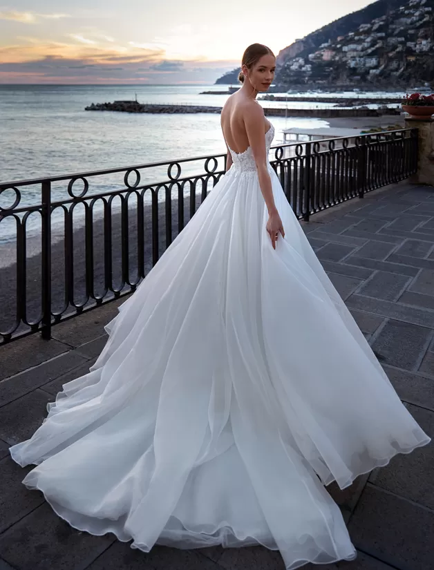 Incantevole abito da sposa scivolato in organza off white co corpino di pizzo smanicato e scollo a cuore. Il ramage è di pizzo tone sur tone è moderno e iper delicato