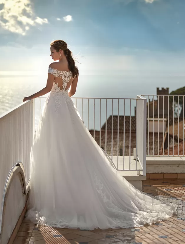 Abito da sposa romantico con gonna in tulle off white linea ad A e un delizioso corpino di pizzo con scollo a barchetta. Il dettaglio floreale sulla schiena è meraviglioso!