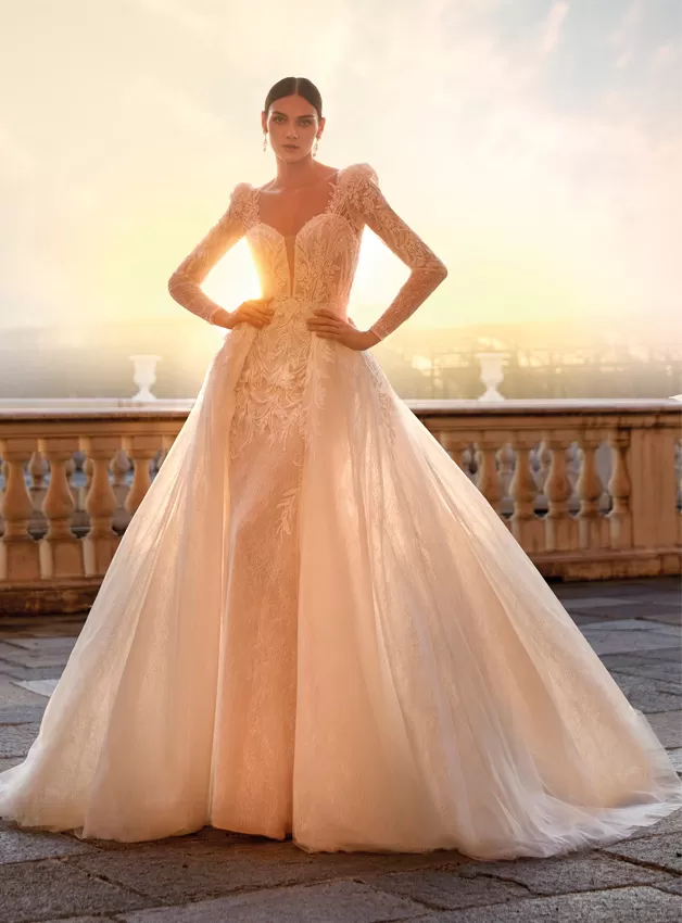 Uno spettacolare abito stile sirena che può essere trasformato in stile principessa con l'aggiunta di una sopragonna. Con ricami incredibilmente intricati sul corpetto e sulla parte superiore della gonna che definiscono i contorni del corpo. La scollatura è sostenuta da un inserto in tulle color nude e da coppe interne, mentre le spalle arricciate e le maniche lunghe aderenti creano un moderno look da sposa in stile rinascimentale.