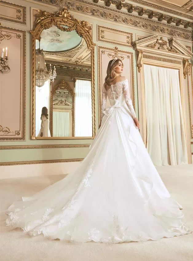 Semplice e minimalista. Un disegno classico in mikado, con scollatura arrotondata e silhouette a trapezio, decorato con un grande laccio sulla schiena. Un abito che può trasformarsi con la giacca in pizzo a maniche lunghe e lo strascico in tulle ricamato.