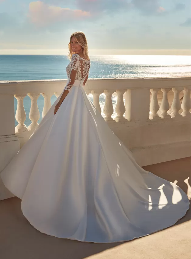 Uno spettacolare gioco di contrasti in cui mikado, tulle semitrasparente e dettagli floreali si fondono in un abito molto femminile. Modelli con maniche a tre quarti semitrasparenti, scollo a V e schiena a barca.