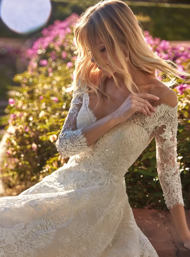Sofisticato abito A-line in pizzo con un elegante scollo a V off-the-shoulder con maniche a tre quarti. Un modello che gioca con il romanticismo del tessuto e la sensualità delle trasparenze per vestire una sposa davvero molto speciale.