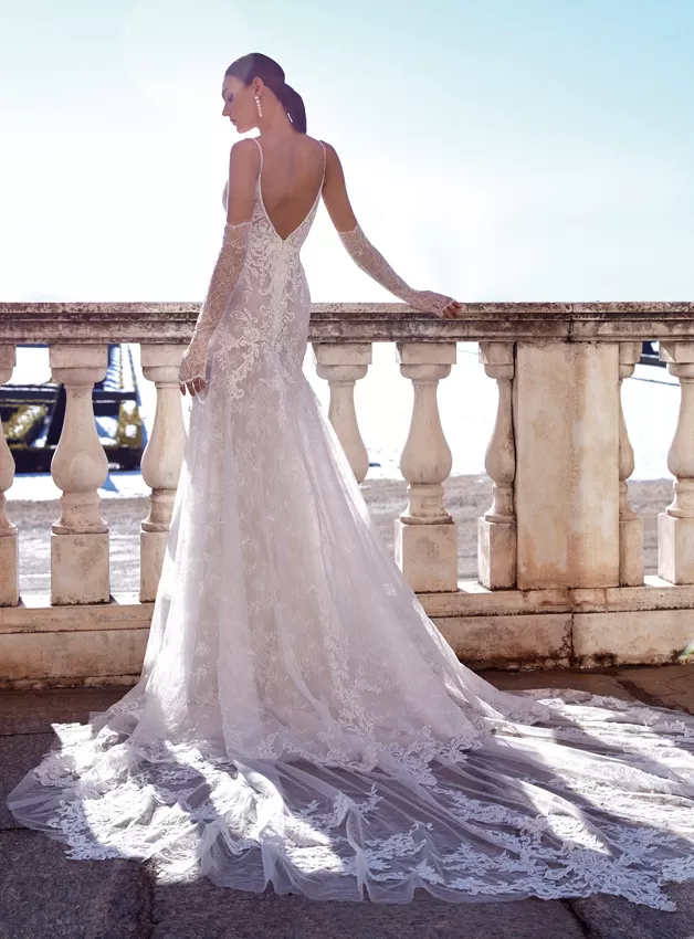 Un look in stile sirena sofisticato e sexy in pizzo all-over e applicazioni ricamate. Con sontuose perline intorno al collo e alla schiena e un incredibile strascico in tulle trasparente rifinito con applicazioni di alta qualità. Le maniche staccabili opzionali aggiungono un ulteriore tocco di glamour.