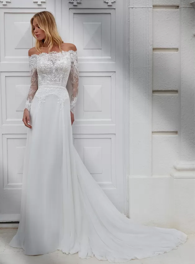 Sensuale abito con corpetto in pizzo e scollo a barca con spalle scoperte e maniche lunghe semitrasparenti. Un modello con gonna fluida in chiffon decorata da una cintura in guipure.
